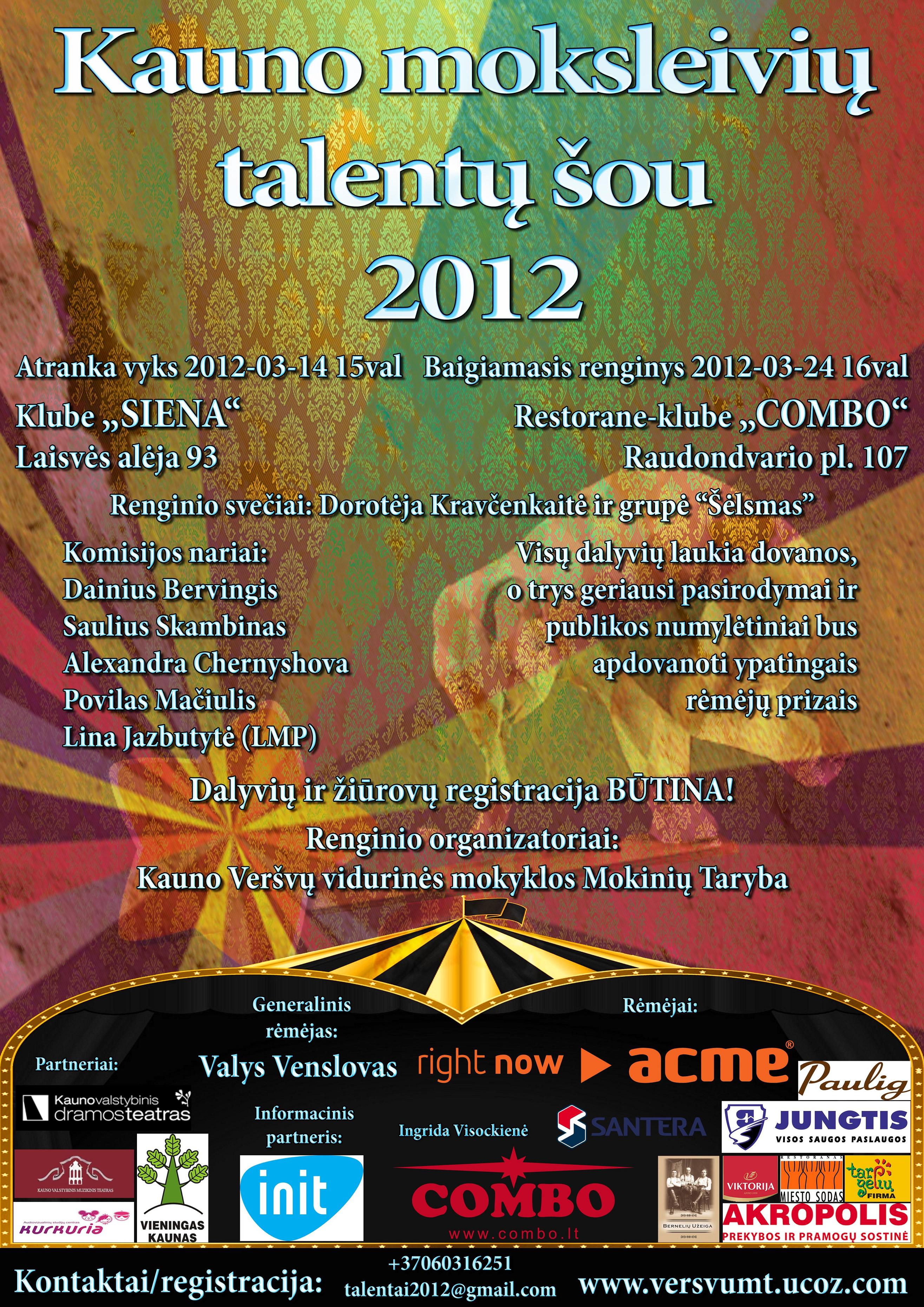 Ar patikėtumėte, jei pasakyčiau, jog moksleiviai gali viską? O jei papasakočiau, jog mokiniai savo jėgomis suorganizavo renginį visų Kauno miesto mokyklų mokiniams, pakvietė bendradarbiauti ir remti daugelį įmonių ir organizacijų, palaikančių jų nuostabią idėją? Vis dar netikite? O jei dar pridurčiau, kad tai visiškai nemokamas ir nekomercinis renginys, kur geriausiai pasirodę moksleiviai buvo apdovanoti nuostabiais autoriniais prizais, o renginio svečiai buvo tikri muzikos, šokio, vaidybos profesionalai. Tie, kurie kovo 24d. 16val. atvyko į klubą ,,COMBO‘‘, įsitikino šių žodžių tikrumu! Ten vyko jau antrus metus iš eilės organizuojamas mitus griaunantis renginys –„Kauno miesto moksleivių talentų šou". Pernai sėkmingai startavęs ir šiemet išaugęs renginys susilaukė didelio visuomenės, o ypač aktyvaus jaunimo dėmesio. Dėl itin gausaus dalyvių būrio šiemet kovo 14 d. klube „SIENA" vyko atrankinis etapas. Jame savo sugebėjimus išbandė apie pusšimtis itin talentingų moksleivių. Iš visų pasirodžiusiųjų buvo atrinkti dvidešimt laimingųjų, kurie finaliniame renginyje varžėsi dėl pagrindinių prizų. Tik šiam renginiui buvo pagaminti ypatingi Švedų menininko spalvoto stiklo prizai, kuriuos įsteigė renginio generalinis rėmėjas Valys Venslovas. Pačius geriausius atrinko tikrieji šokio, meno, muzikos ir jaunimo politikos ekspertai – Saulius Skambinas, Dainius Bervingis, Povilas Mačiulis, Lietuvos mokinių parlamento atstovė Lina Jazbutytė ir garsi operos solistė iš Islandijos Alexandra Chernyshova. Naudojant specialų aparatą publikos aplodismentams skaičiuoti, publikos numylėtiniais išrinkti Arūnas Švarcas ir Andrius Juočeris iš Pilėnų vidurinės mokyklos. Jie laimėjo Kauno valstybinio muzikinio teatro įsteigtą prizą. Trečiąją vietą užėme ir nešiojamuosius ACME garsiakalbius laimėjo Isabelle Mia ir Gabrielė Stankevičiūtė iš M. Mažvydo ir šv. Kazimiero vidurinių mokyklų. Na, o antrosios vietos ir unikalaus dizaino Acme audio kolonėlių laimėtojais tapo grupė „Mediniai akmenys" iš Stepono Dariaus ir Stasio Girėno gimnazijos. Ir pačios garbingiausios pirmosios vietos ir pirmojo lietuviško planšetinio kompiuterio ACME laimėtojai – šokėjų grupė „Katiliukai" iš Kauno technologijos universiteto gimnazijos. ... Skaityti toliau » |